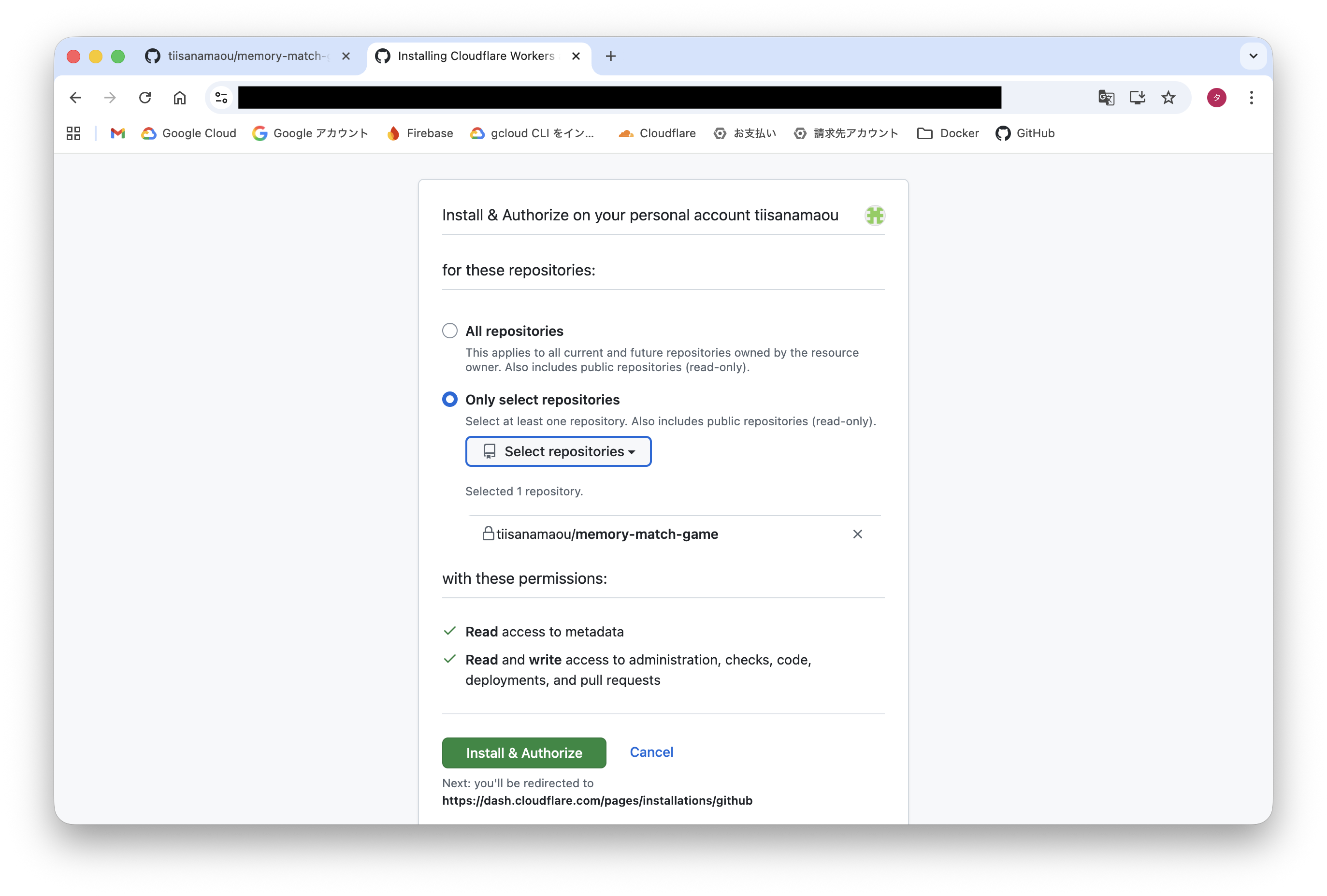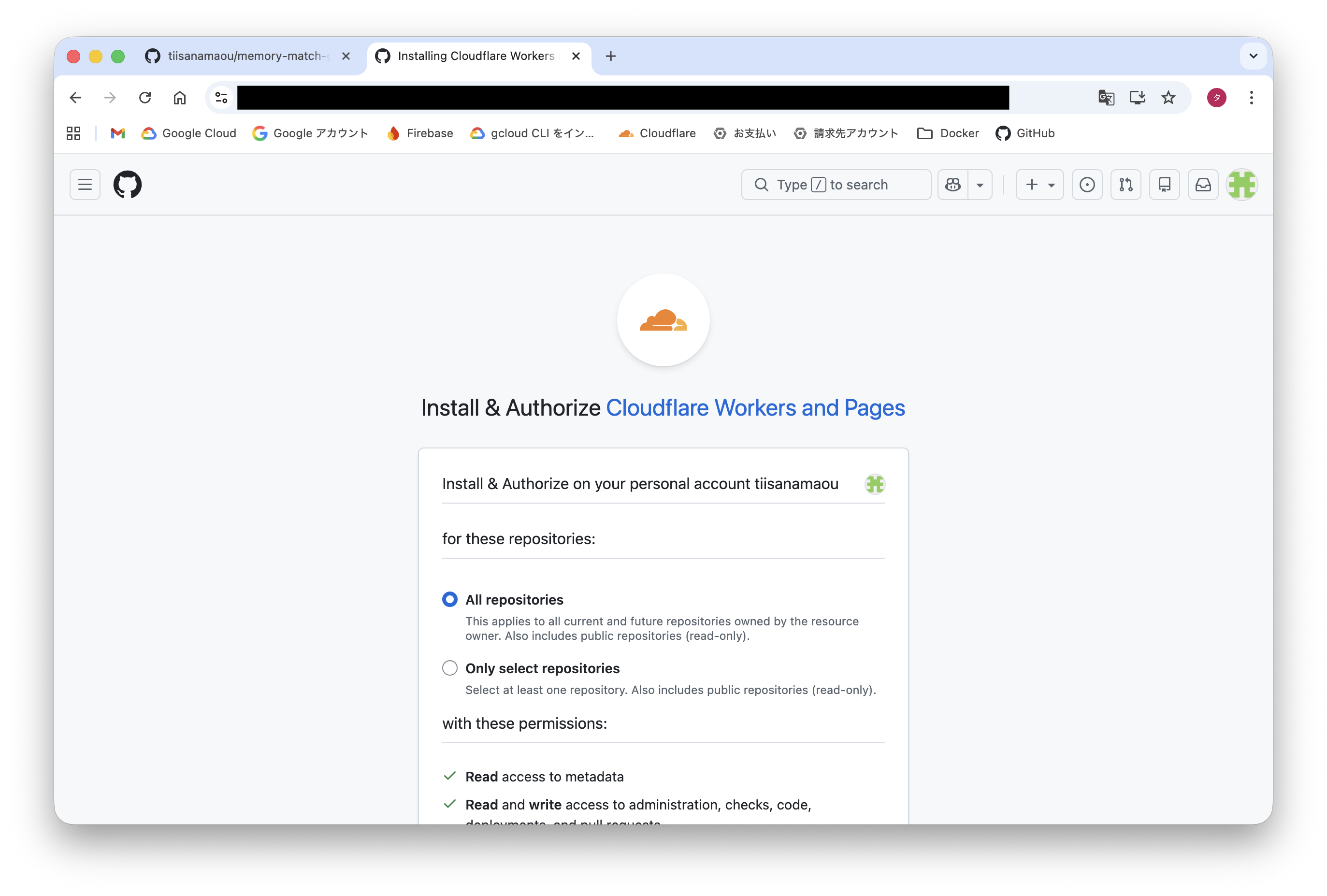 このとき"All repositories"でも良いが、必要なリポジトリのみ許可したいので"Only select repositories"を選択する