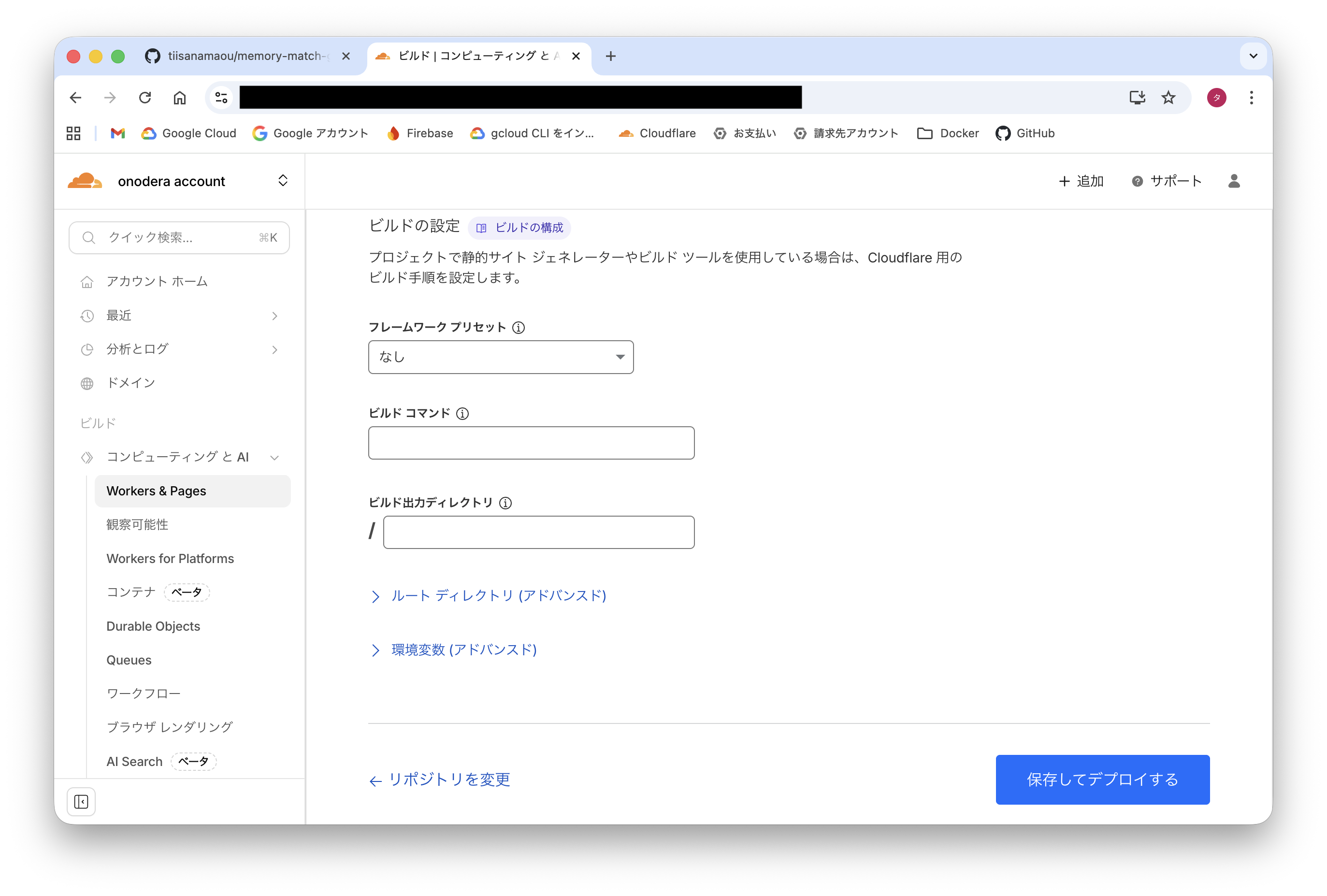 下の方のビルドの設定は、今回はHTML等のファイルを直接リポジトリにプッシュしているので特に設定しません