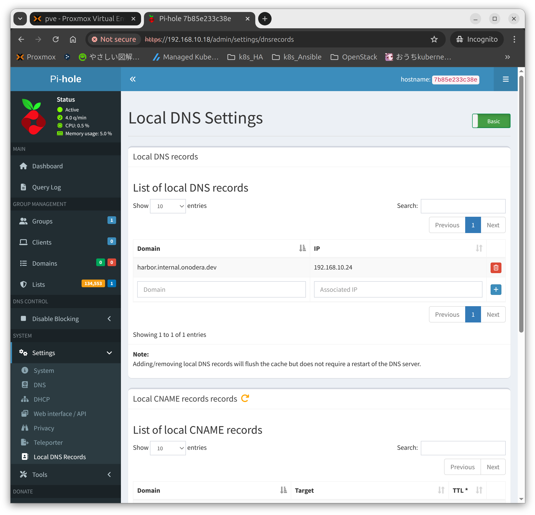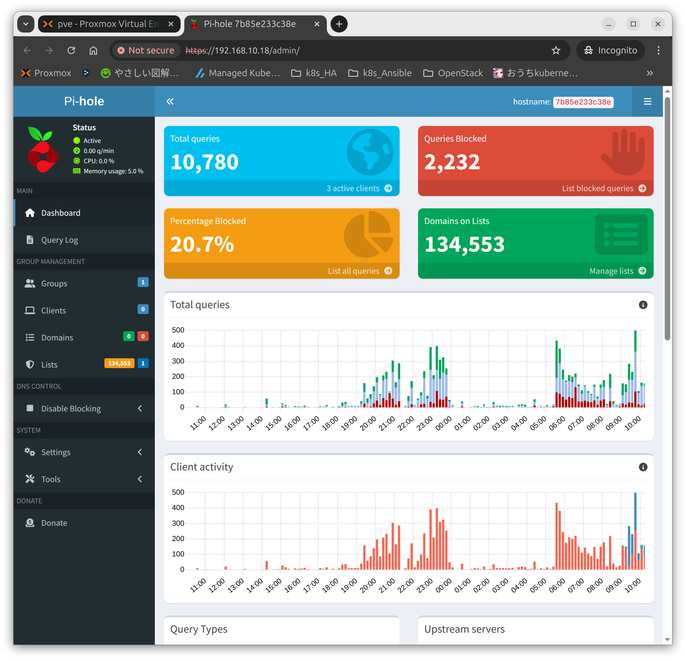 7b85e233c38e pihole/pihole:2025.03.0 "start.sh" 12 days ago Up 12 days (healthy) 0.0.0.0:53->53/tcp, [::]:53->53/tcp, 67/udp, 0.0.0.0:80->80/tcp, [::]:80->80/tcp, 0.0.0.0:443->443/tcp, 0.0.0.0:53->53/udp, [::]:443->443/tcp, [::]:53->53/udp, 123/udp pihole