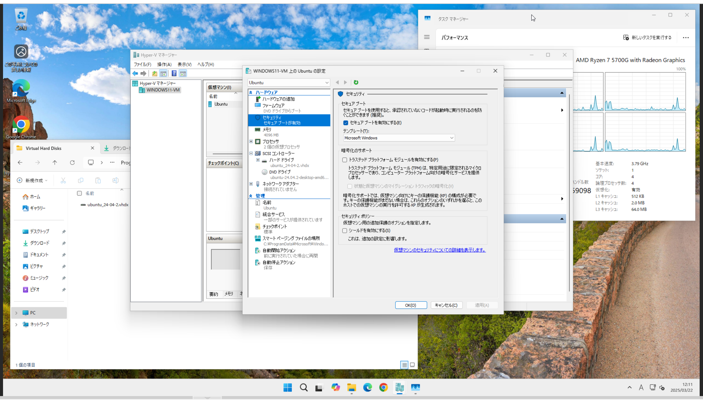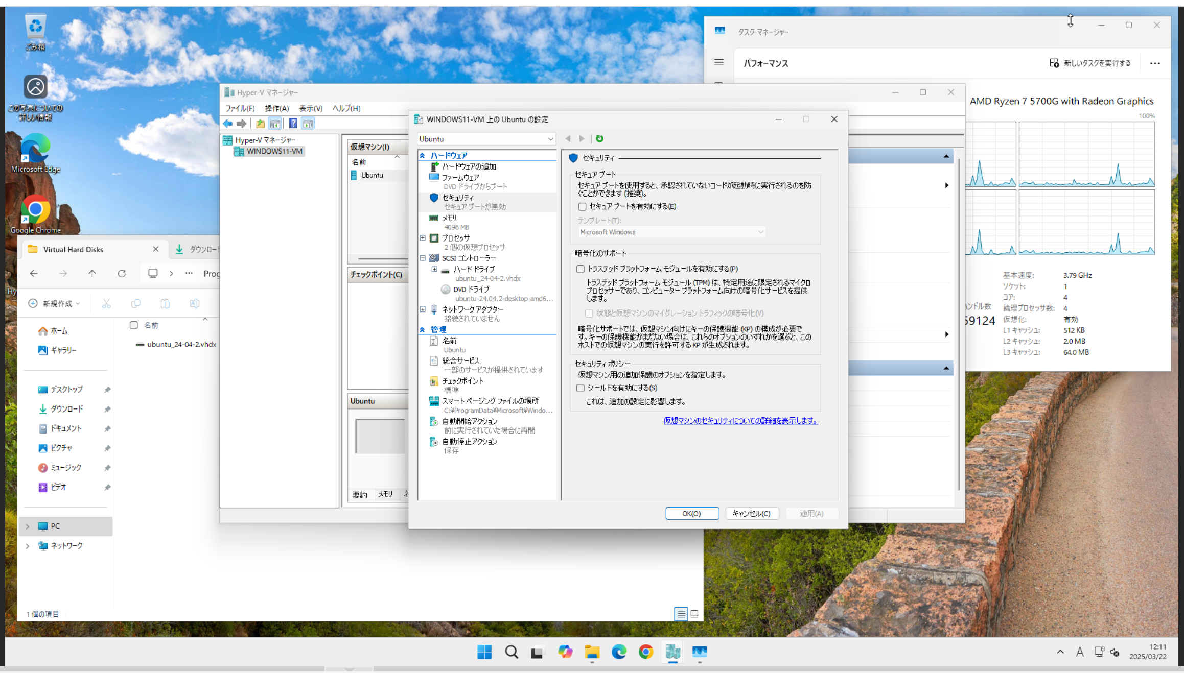 “セキュリティ"の"セキュアブートを有効にする"のチェックを外し"適用"をクリックします