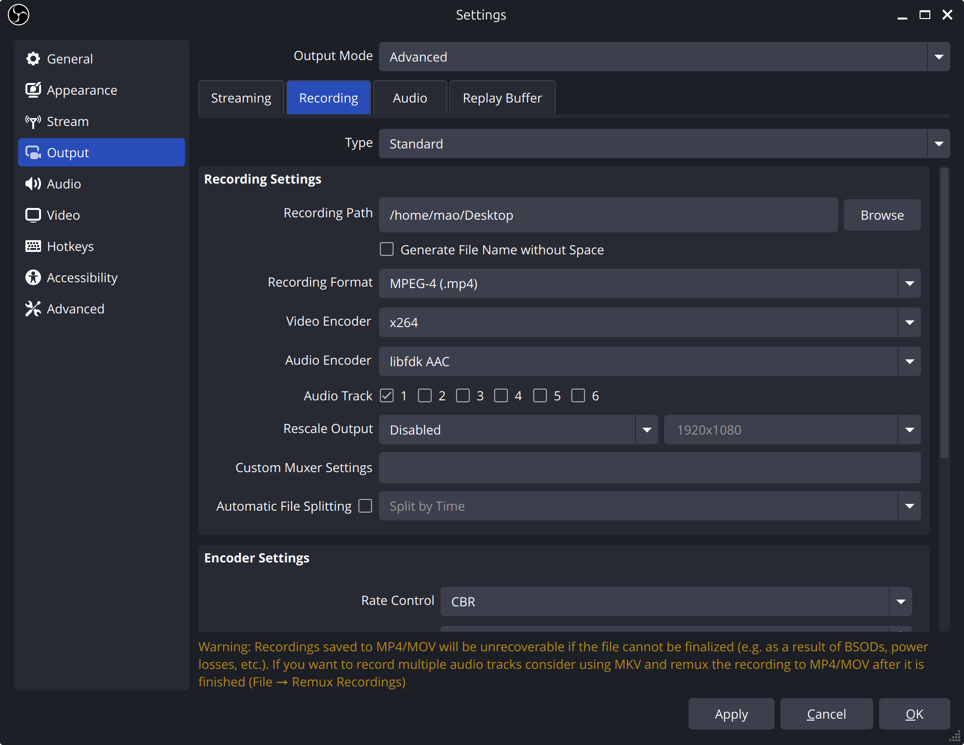 “Settings"をクリックして、“Output"の"Output Mode"を"Advanced"にする